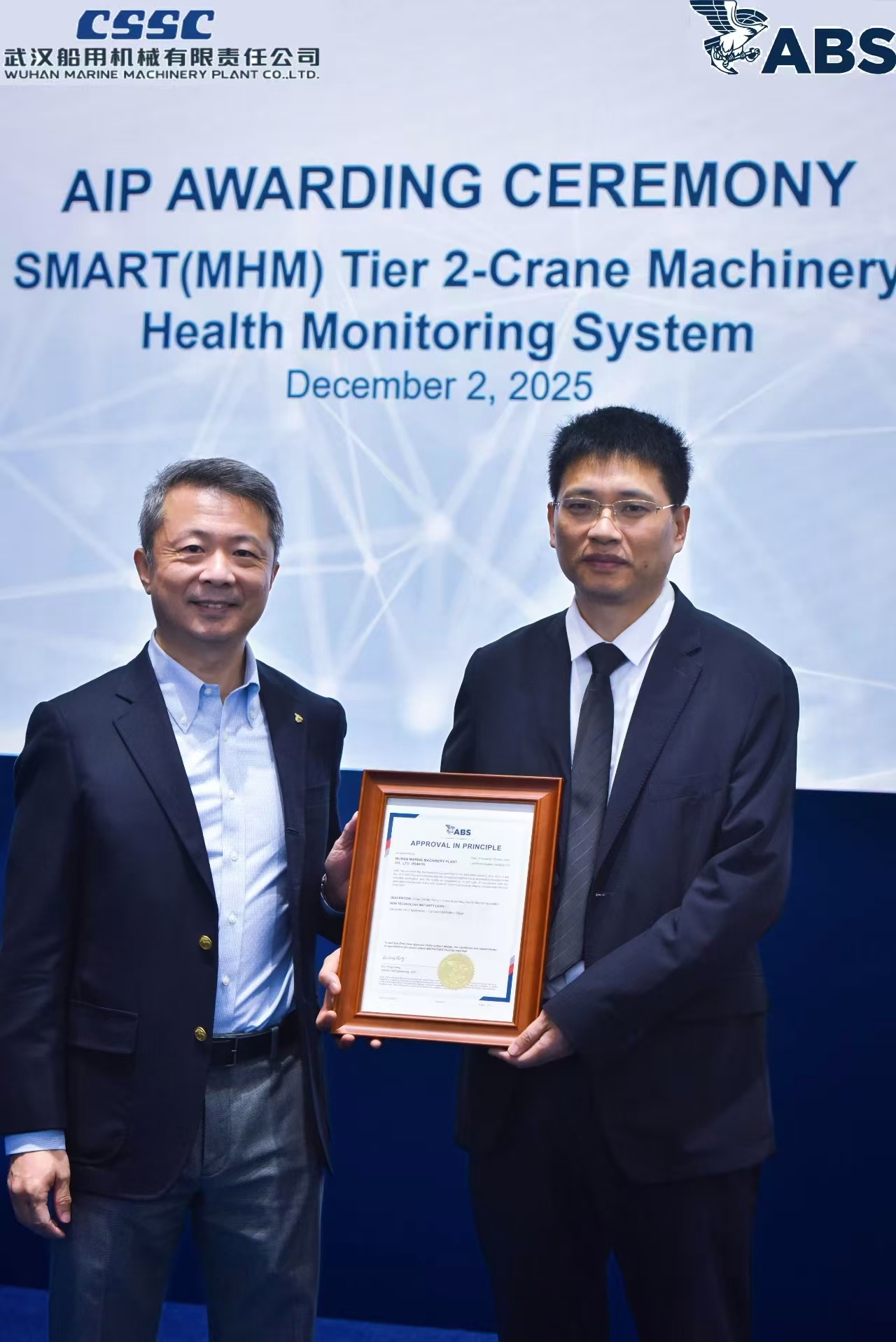 12月2日,2025年中國國際海事技術(shù)學(xué)術(shù)會議和展覽會開幕首日,中船武漢船機(jī)開發(fā)的海工吊機(jī)智能化健康監(jiān)測系統(tǒng)(SMART系統(tǒng))獲得ABS船級社SMART(MHM TIER 2)原則性批準(zhǔn)(AIP),這是國內(nèi)海工吊機(jī)首個成功取得該AIP認(rèn)證的系統(tǒng)。ABS船級社技術(shù)副總裁谷海、中船武漢船機(jī)副總經(jīng)理胡發(fā)國出席發(fā)證儀式。